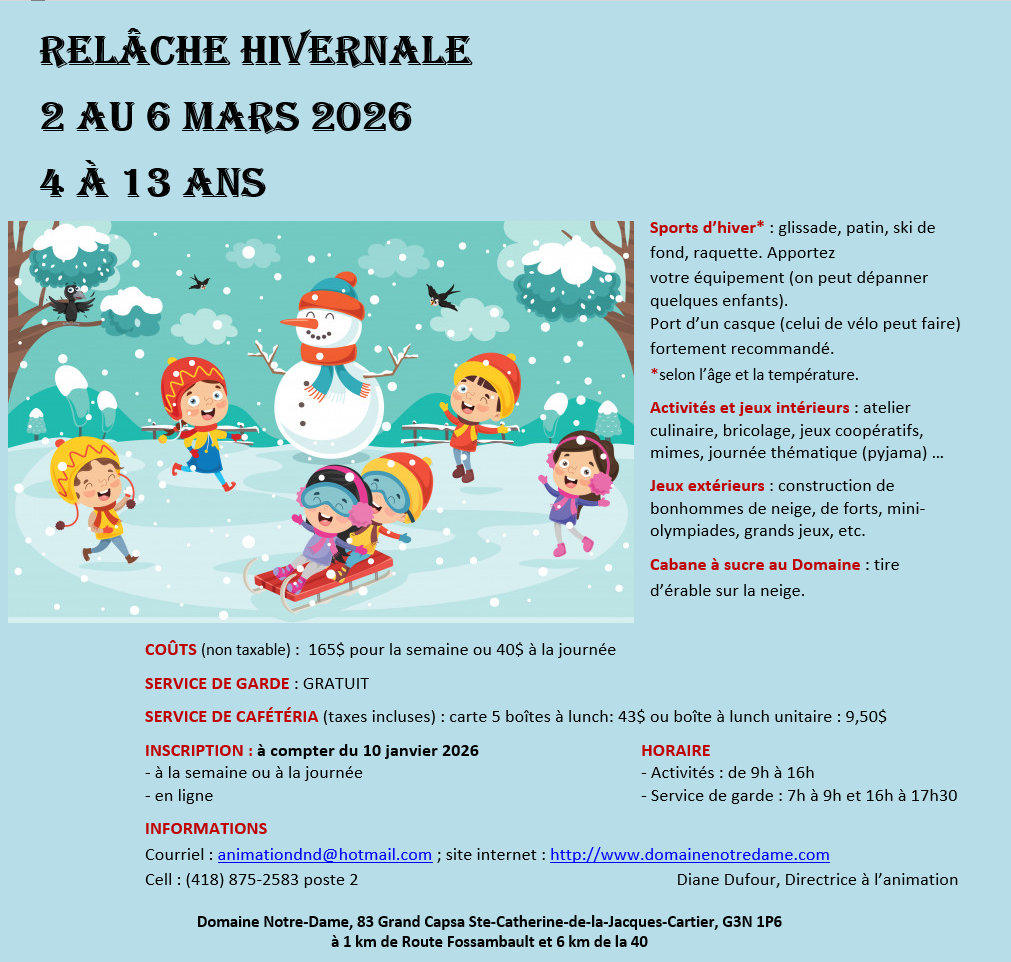 Vous n’avez pas trouvé l’information que vous cherchiez dans le Guide des parents ou vous voudriez visiter le site, adressez-vous à Mme Diane Dufour (Tornade), Directrice à l’animation, par ce courriel : animationdnd@hotmail.com ou appelez au 418 875-2583 poste 2